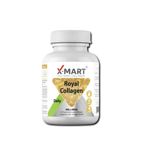 رویال کلاژن ایکس-مارت یک مکمل کلاژن ساز است که با داشتن کلاژن هیدرولیز شده نوع 1 و 3، به سلامت پوست، مو و ناخن کمک مى کند. هر قرص این مکمل حاوى 833 میلى گرم کلاژن هیدرولیز شده است که ظاهر پوست را بهبود بخشیده و منجربه افزایش آبرسانى، افزایش خاصیت ارتجاعى و استحکام، کاهش چین و چروك و جوان سازى پوست مى شود. کلاژن هیدرولیز شده در افزایش استحکام ناخن ها و کاهش دفعات شکستن آن ها موثر است.